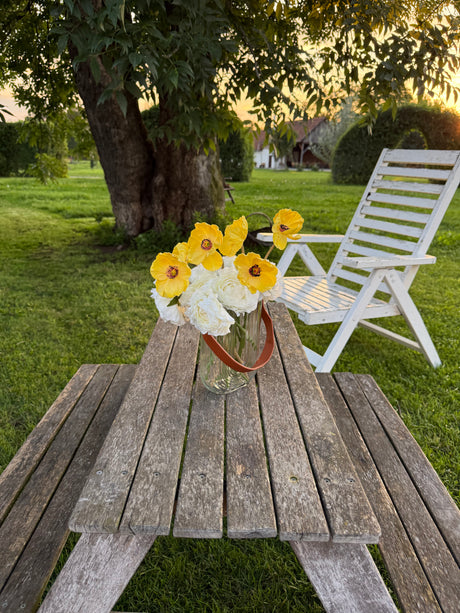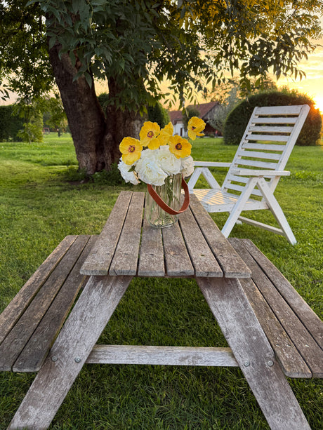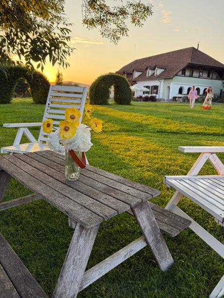 Buchet Artificial cu 11 Fire – Anemone Galbene si Ranunculus Albi, 28 cm, Vaza Inclusa